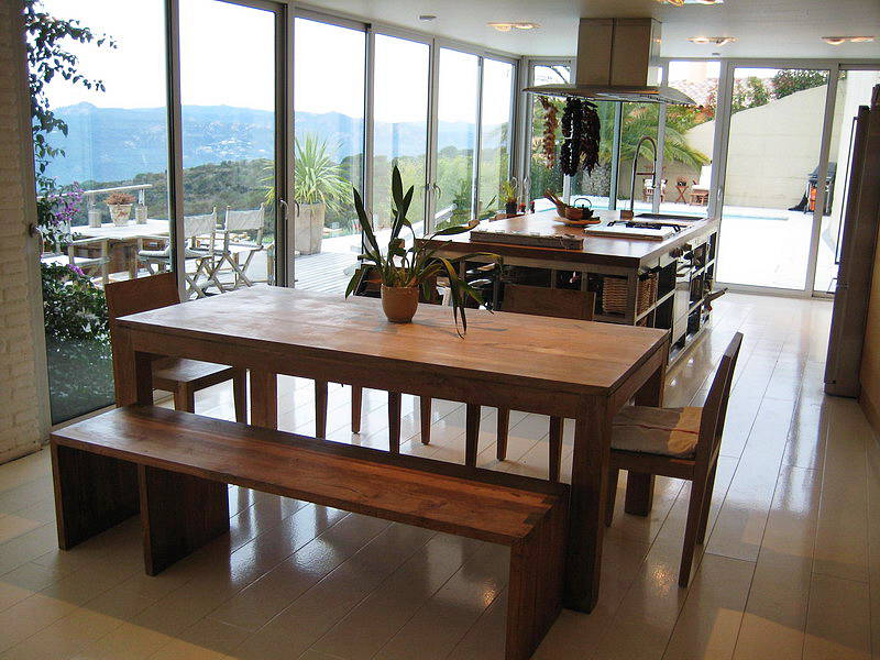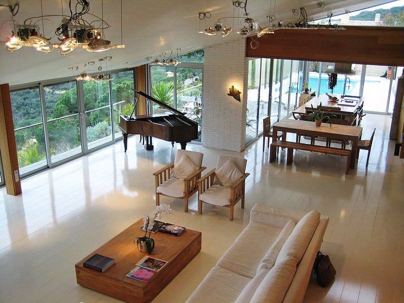 Основной дом, гостевые апартаменты, бассейн. Вокруг – много зелени – маленьких садов в восточном стиле. В основном доме – большое светлое пространство, включающее гостиную, столовую, кухню, спальни – в форме модульной деревянной структуры.