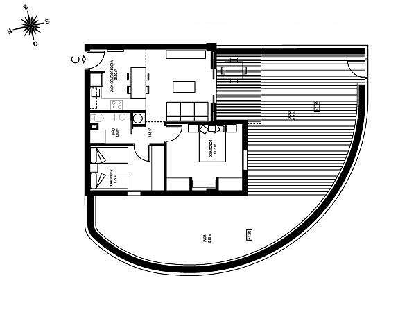 На нижнем этаже предлагаются квартиры с 2 спальнями и 1 ванной комнатой (от 64,67 до 77,34 м2) и большими земельными участками и террасами (от 121,31 до 211,61 м2).