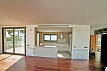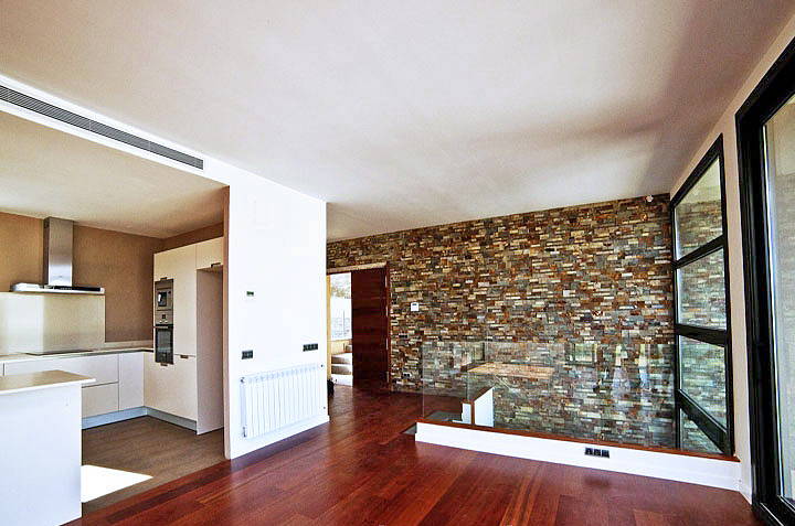 На площади 424 м2 располагаются гостиная-столовая с кухней, 3 спальных комнаты плюс жилая комната на нижнем этаже, 4 санузла с душем или ванной, туалет.