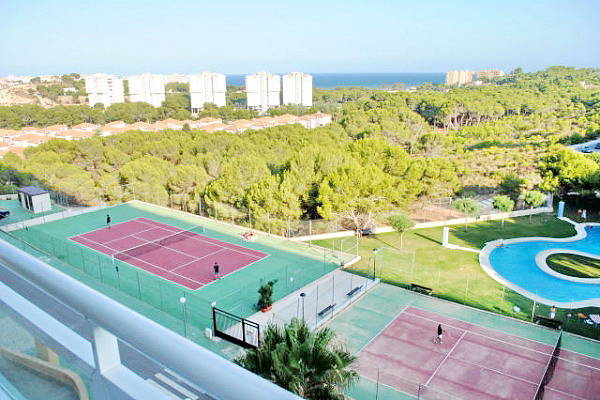 Квартира с 2 спальнями, 1 ванной комнатой, гостиной / столовой комнатой, кухней, террасой с видом на теннисные корты, парк и море.