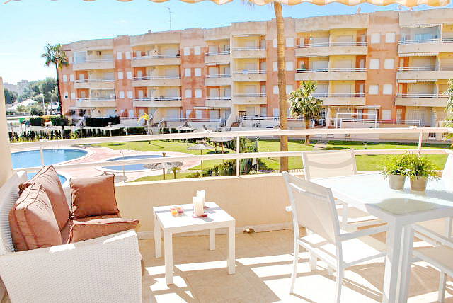 Квартира с 2 спальнями, 1 ванной комнатой, кухней, подсобным помещением, гостиной, большой террасой с красивым видом на бассейн.