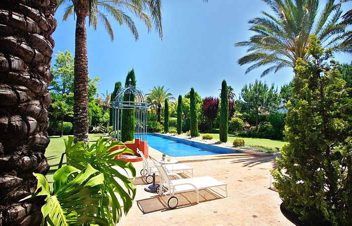 Сад с субтропическими и средиземноморскими деревьями и растениями, большой бассейн по краям которого растет