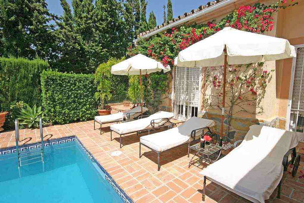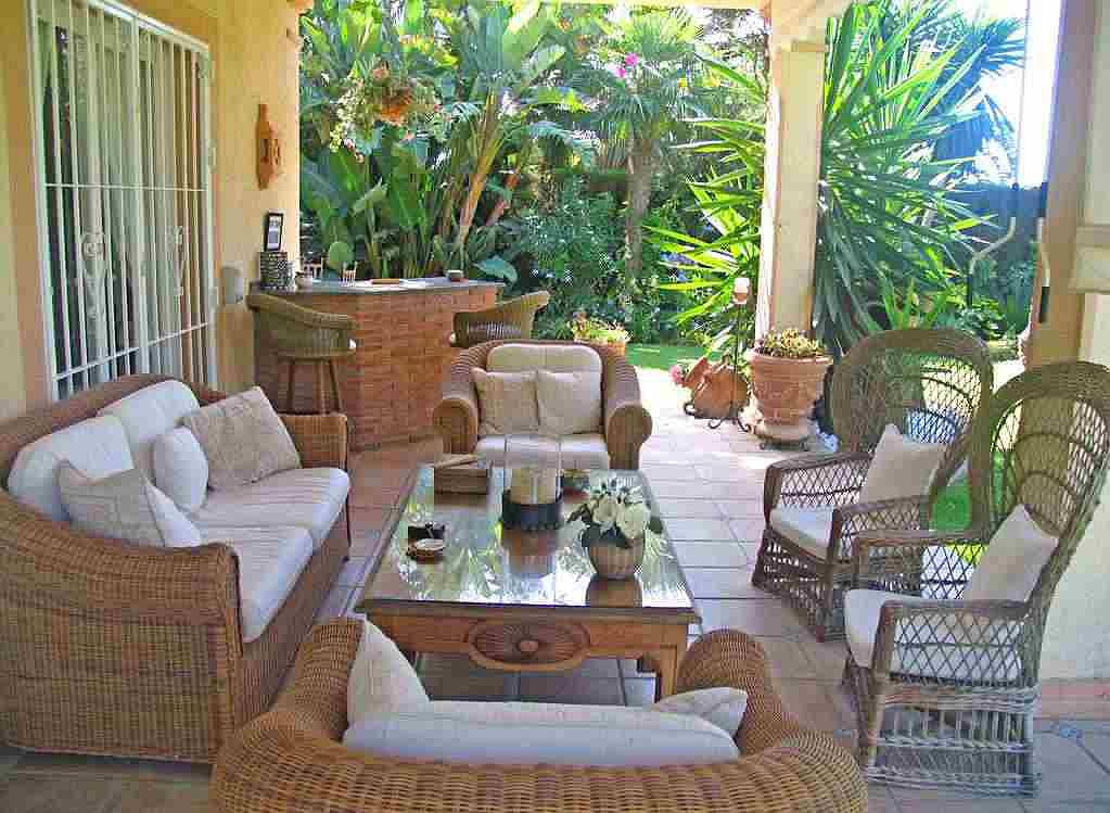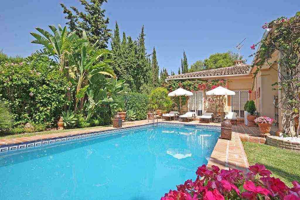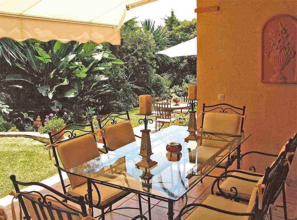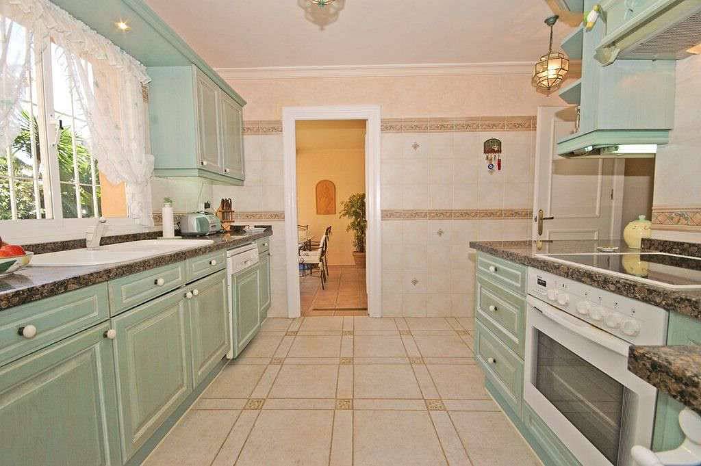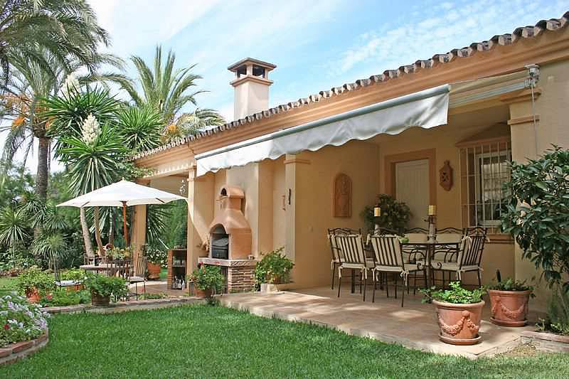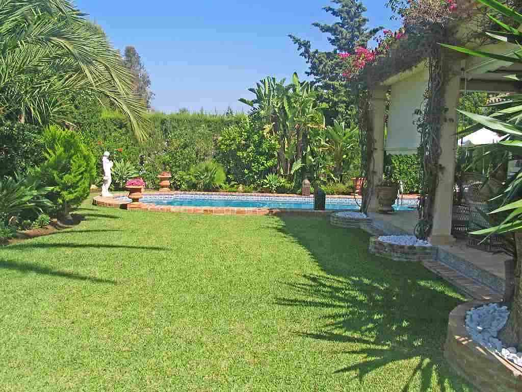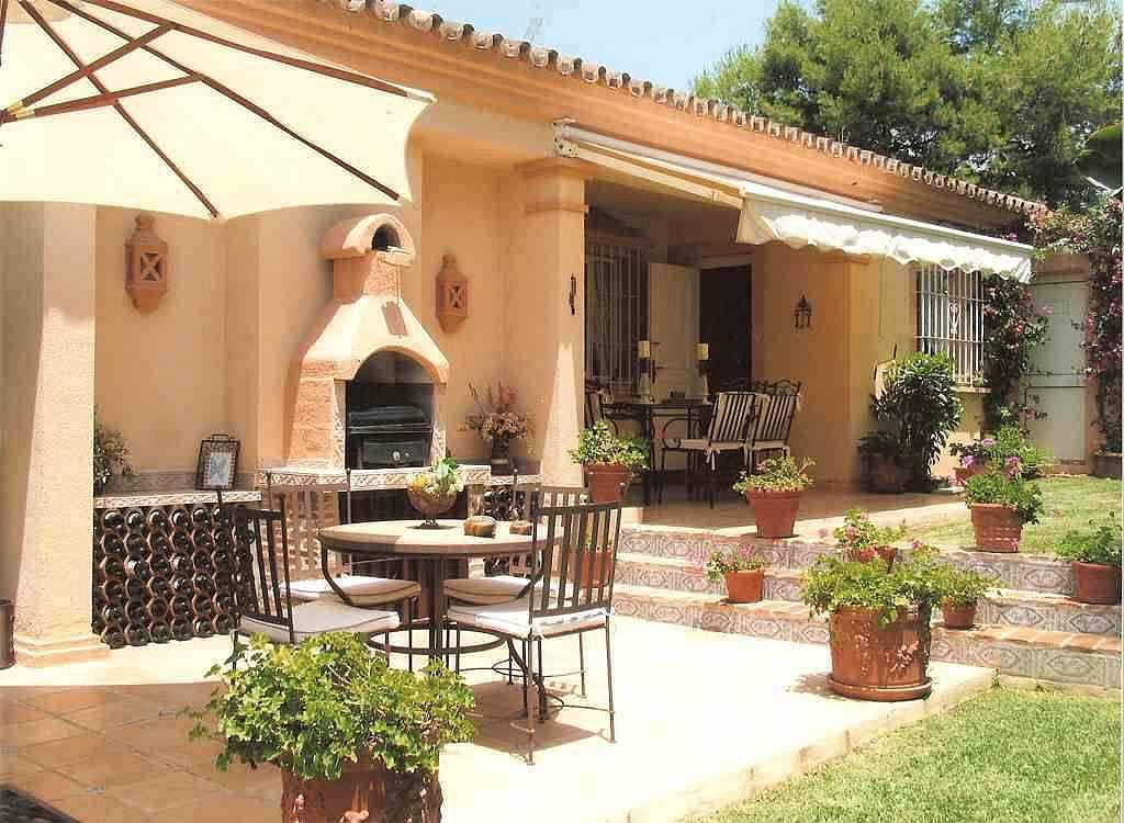 Красивая, одноэтажная вилла в андалузском стиле с очень красивым садом. 4 спальни, 2 ванные комнаты, душевая комната, гостевой туалет, гостиная/ столовая с камином, кухня с выходом к прекрасной обеденной террасе с барбекю, прачечная и винный погреб.