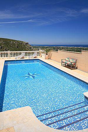 Центральную зону обзора занимает мозаичный бассейн, с летней кухней и барбекю, а также, приятные уголки для неспешного завтрака.