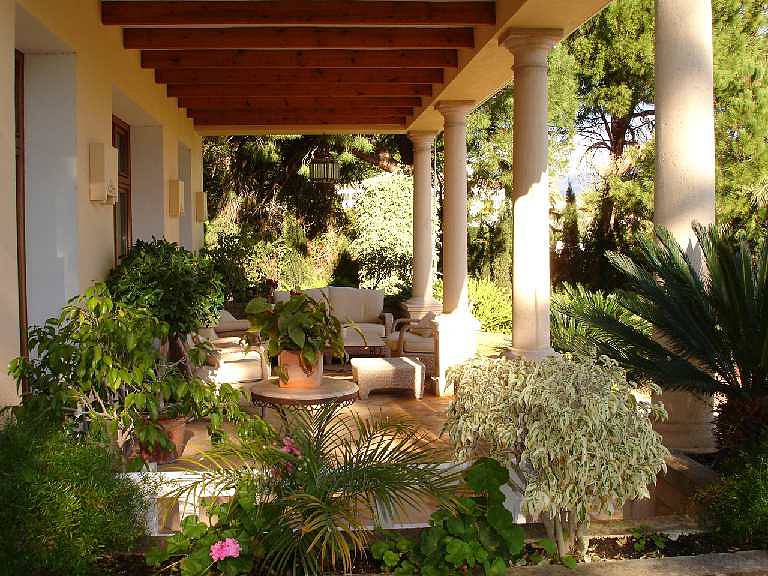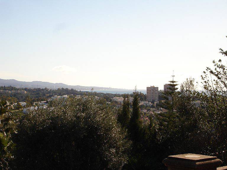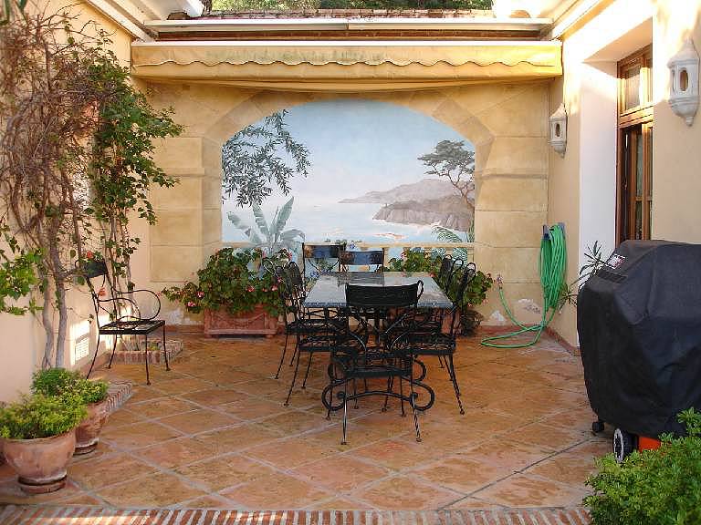 Вид на море с верхнего этажа. В элегантном-рустик стиле с мавританскими деталями; терракотовые полы, в ванных комнатах плитка ручной работы, деревянные балки и оконные рамы из древесины ироко.