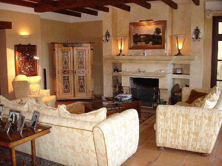 Первый этаж: холл, гостевой туалет, кухня открытого типа ,столовая, подсобное помещение, кладовая, гостиная с камином, 2 спальни, 1 ванная комната, гараж на две машины с прямым доступом в дом и отдельная гостевая спальня с ванной комнатой, сауной и выходом в сад.