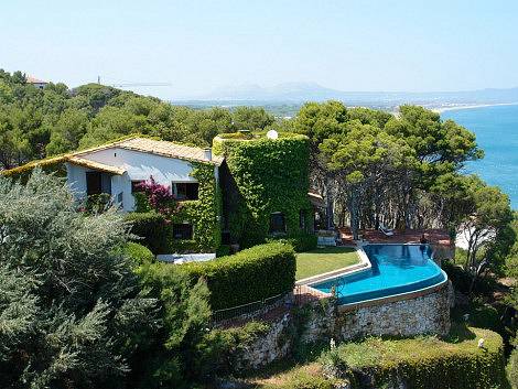 Классическая вилла на Коста Браво с оригинальным бассейном зрительно сливающимся с морской далью и террасой, нависающей над морем.