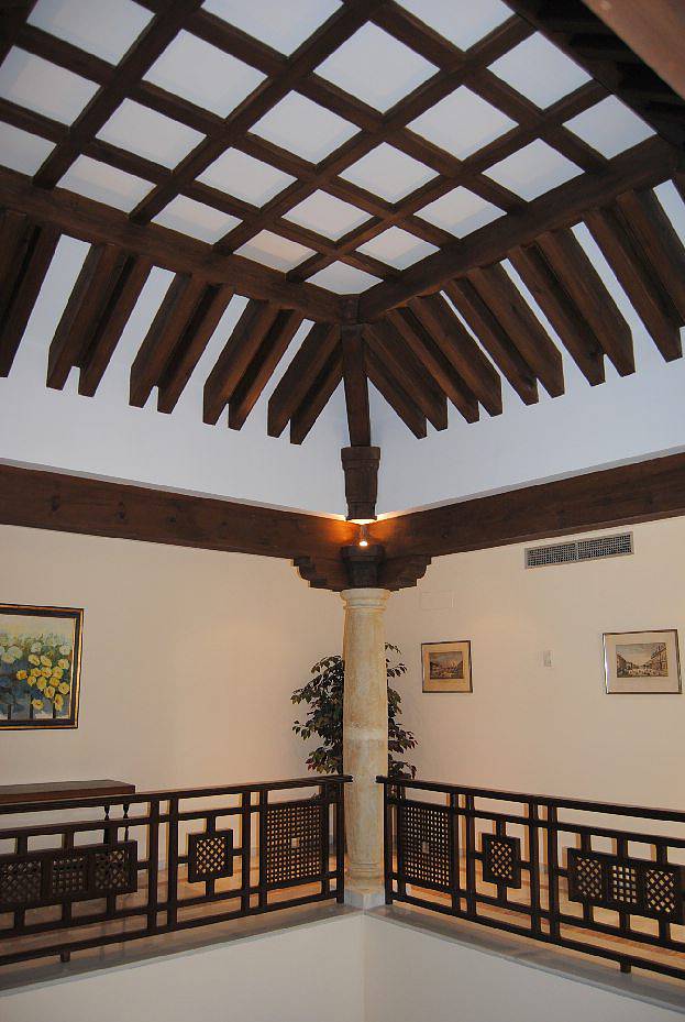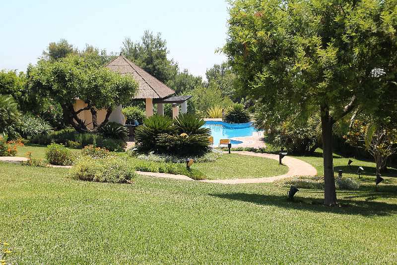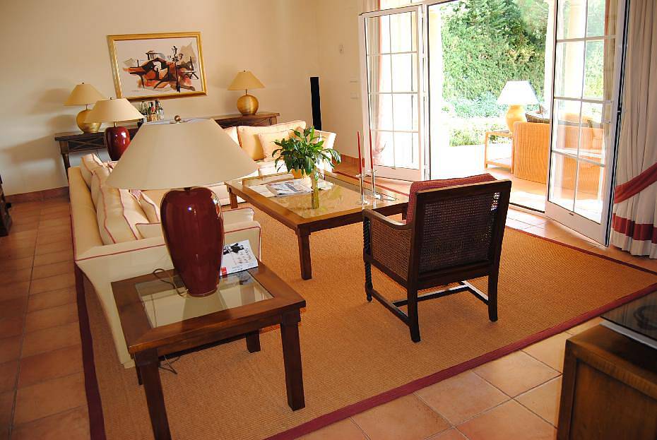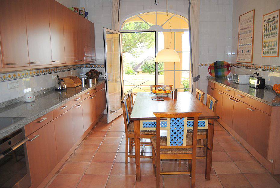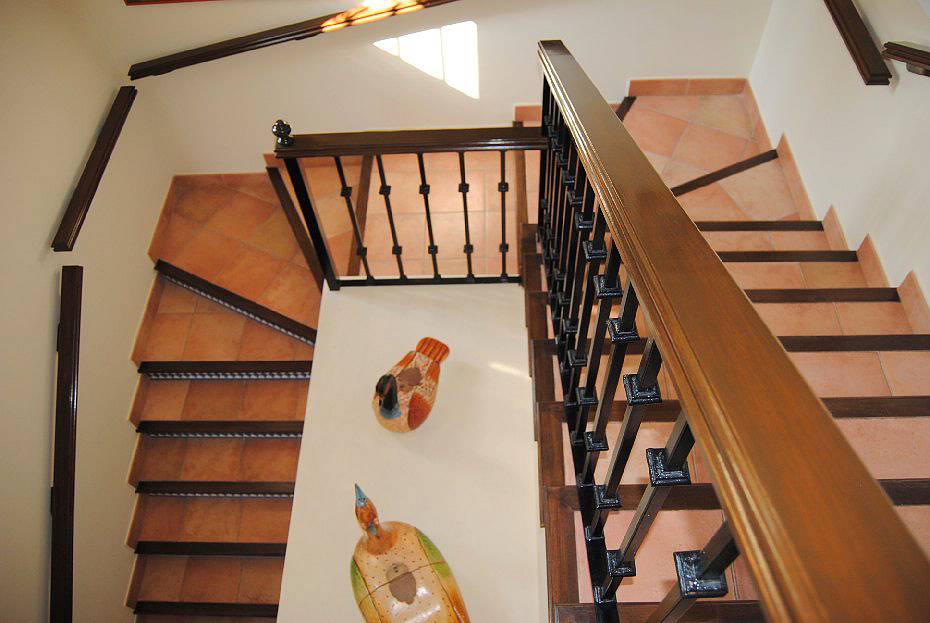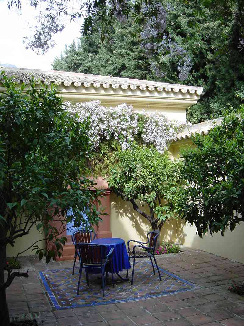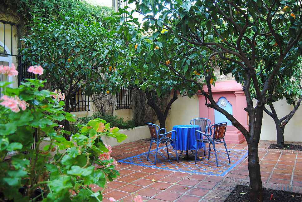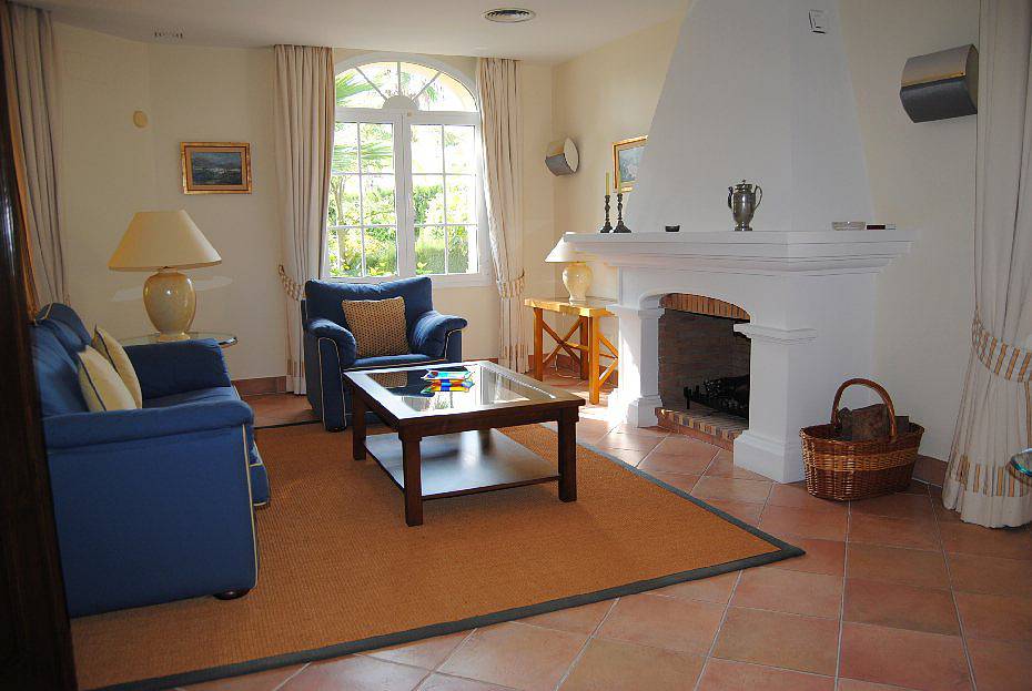 с камином, столовая, кабинет, кухня, гостевой туалет, андалузский дворик (патио) с фруктовыми деревьями и крытые террасы.
