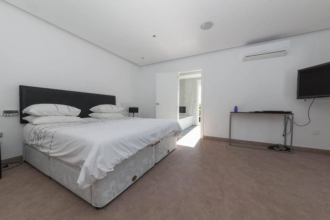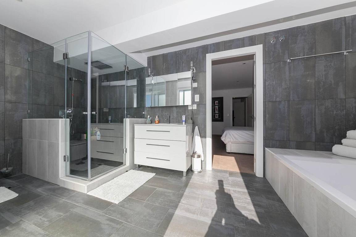 Главная спальня с выходом к бассейну и террасе. Прогулка в раздевалке, ванная комната с большой ванной и душевой кабиной.