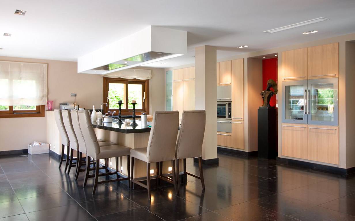 Кухня оборудована высококачественной мебелью с островным блоком, столешницами из гранита и полным набором встроенных приборов.