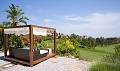 Вне садов заложены для удобства обслуживания и включают в себя различные террасы, включая крытую террасу в задней части дома с палубной террасой у бассейна и бесконечный бассейн.