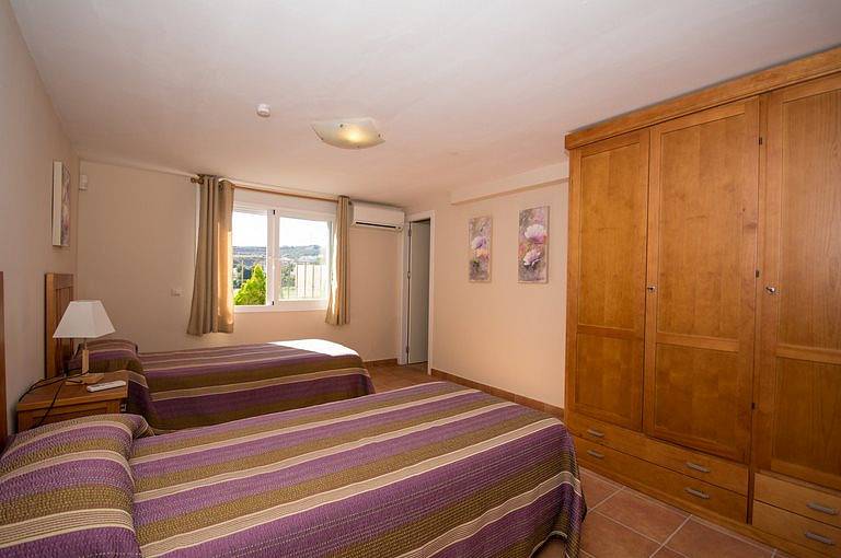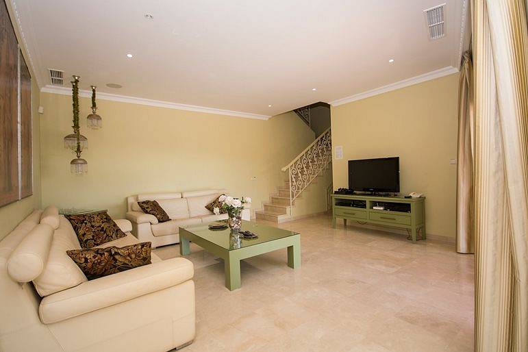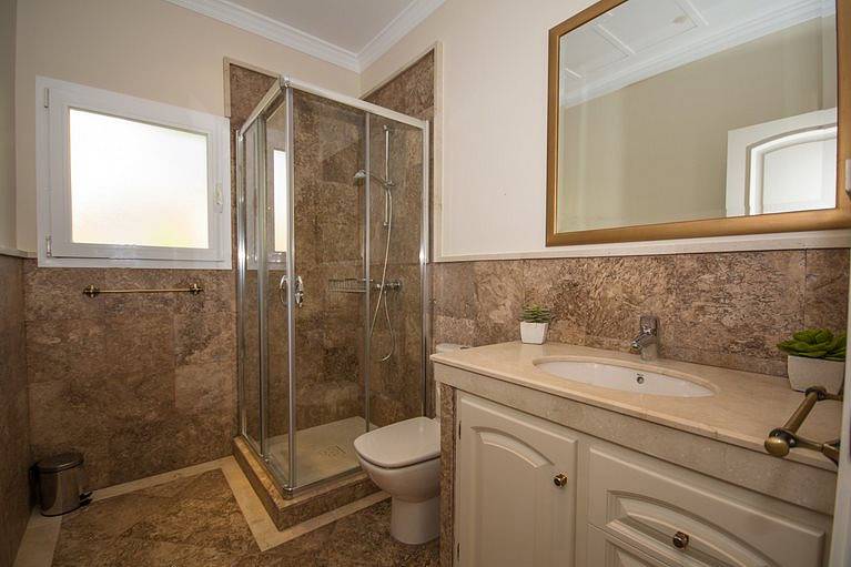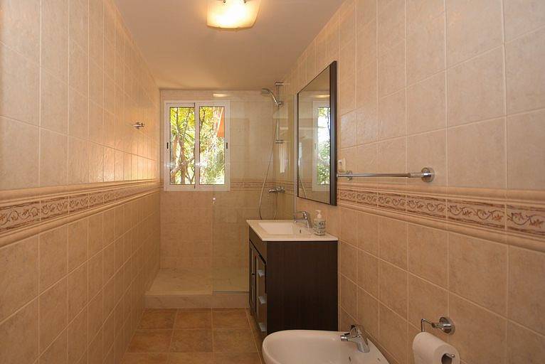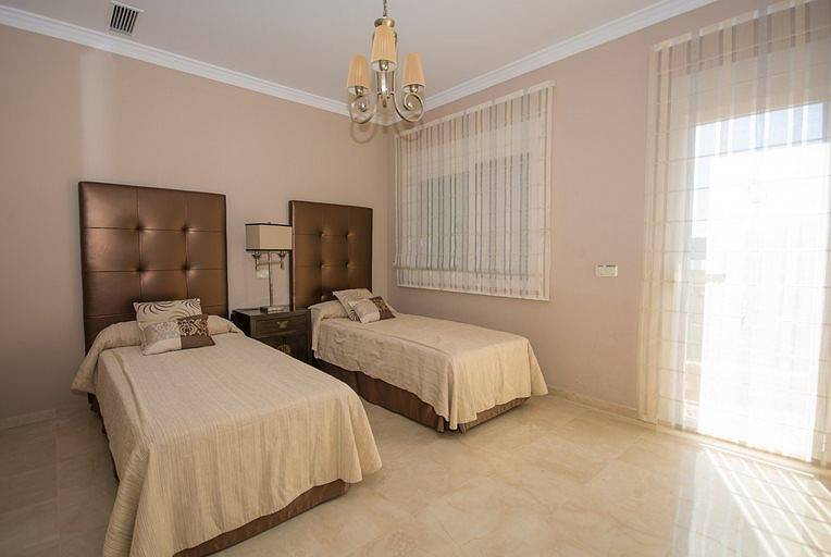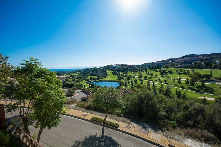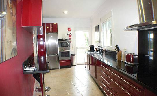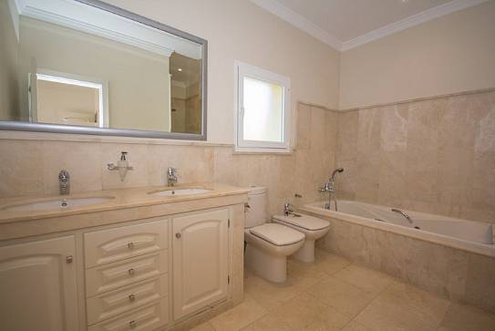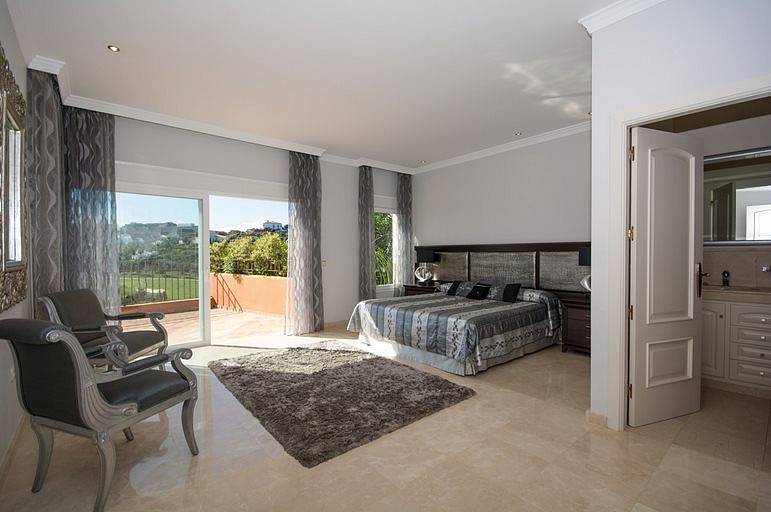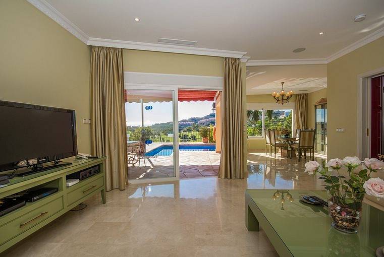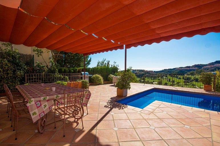 Villa has three bedrooms upstairs which is the main entrance, and a fourth bedroom on the ground floor where we can find living room two rooms more and the kitchen all with direct access to the pool, on a lower floor it has access to the garages We find a fifth bedroom overlooking the golf course in suite which could be perfectly independent apartment.