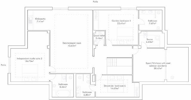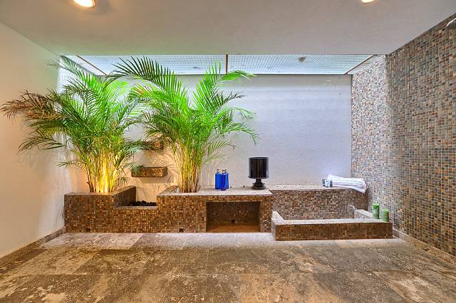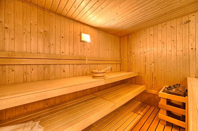 Spacious Fin Sauna with semi in/outdoor sports/wellness area (shower, footbath, water feature, planters).